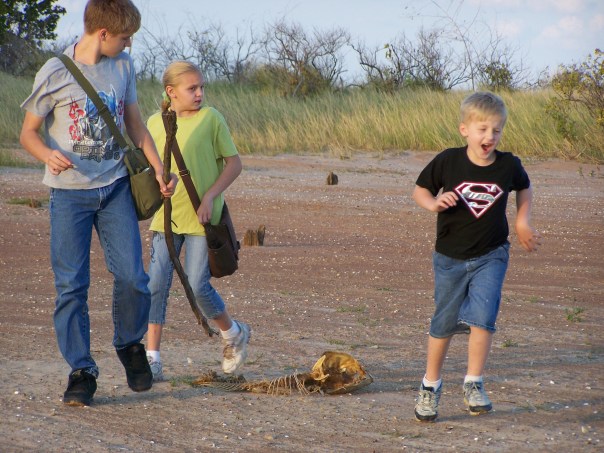 The drought had lowered lake levels enough to give way to a nice-sized beach area for the kids to explore. I made each child what I call their “S.C.O.U.T.” bag. S.C.O.U.T. stands for Science Collection Outdoor Utility Tote. These bags carry specimen containers, tweezers, magnifying glasses, sketch paper, notepads, pencils, and bug identification books. All the things a young scientist needs to take samples and investigate the world around them. The two older kids remembered their totes, but Adam forgot his. Not that he was too concerned—Adam, being the youngest, knew his loving family would help keep up with the treasures he found along the way. Without the burden of a bag to tote around, he was free to go full throttle the whole time.