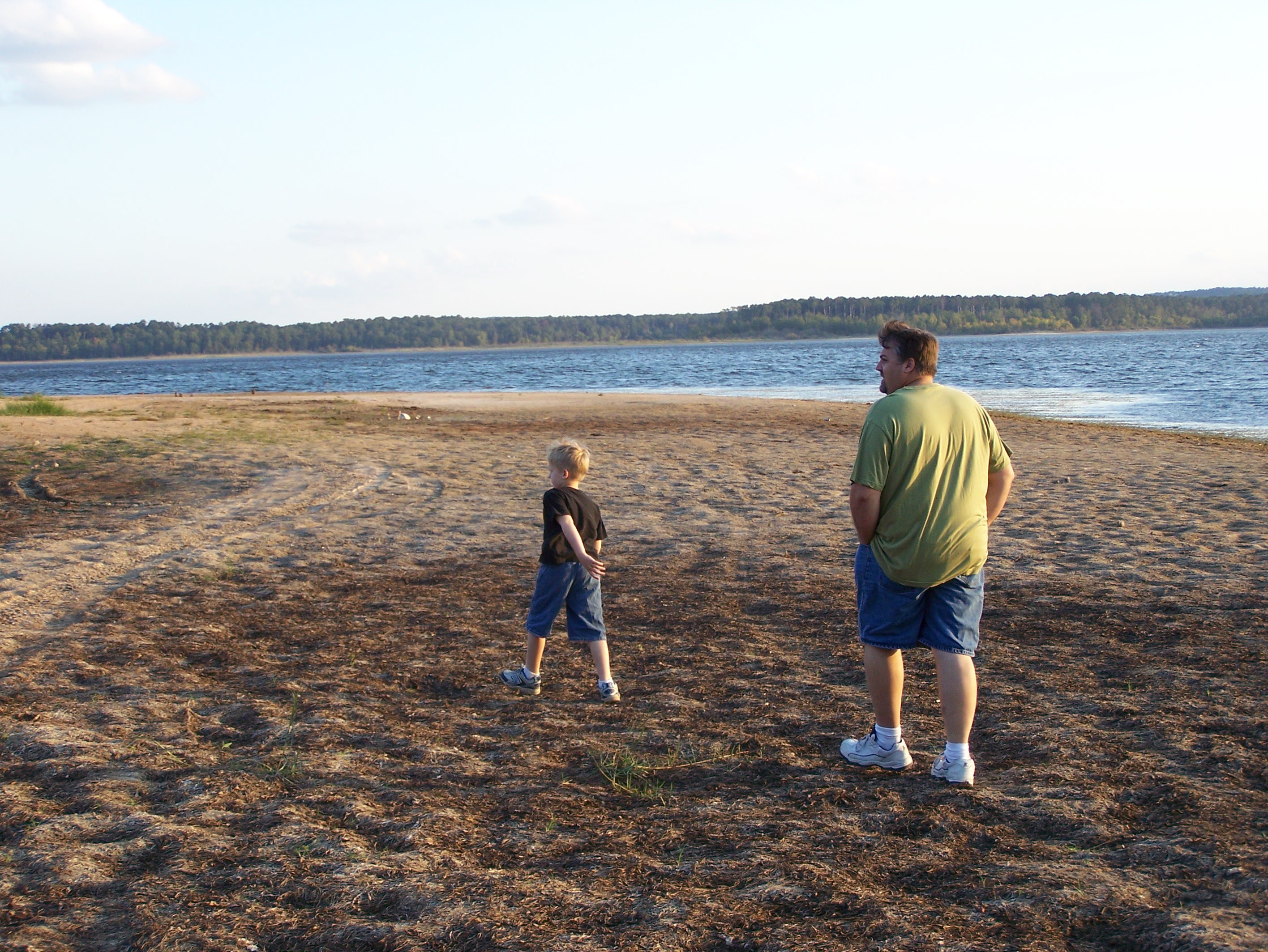 We discovered a freshly emerged plant, raccoon tracks, and mini sand dunes created by the wind blowing across the dry lake bed. Every time I stopped to take a picture, I would announce, “Oh, cool, check it out,” and then, to my surprise, I would get the back of a little head in the viewfinder of my camera! Adam’s curiosity photo bombs were good; it meant he was engaged and interested. We collected a feather and saw a crawfish hole, a large dog or cat print, and a deer or hog print. Then we came upon a very large dead fish, which did not smell the greatest. Adam shouted, “Ewww, gross!” But it had nice, large scales that became part of our treasures for home study.