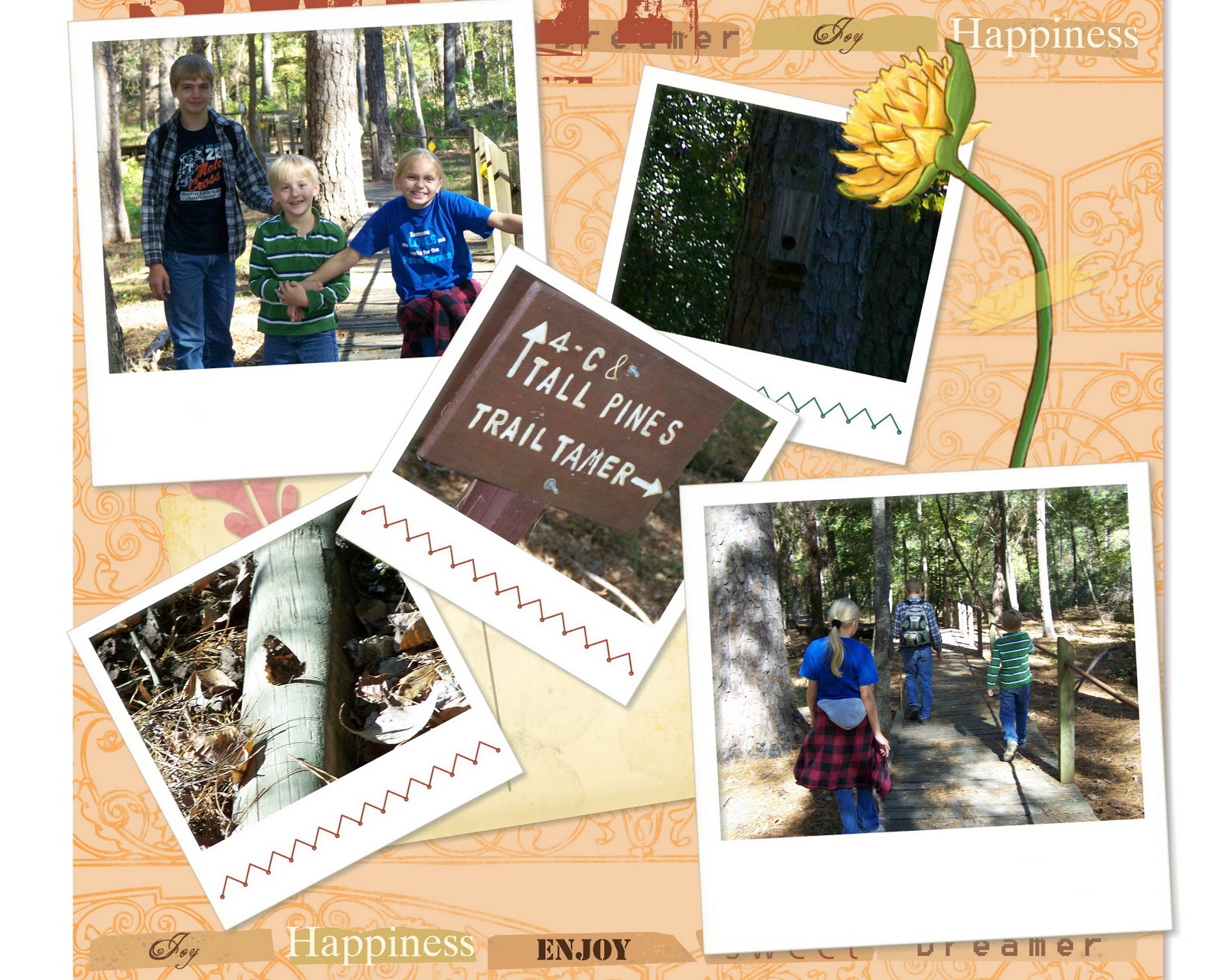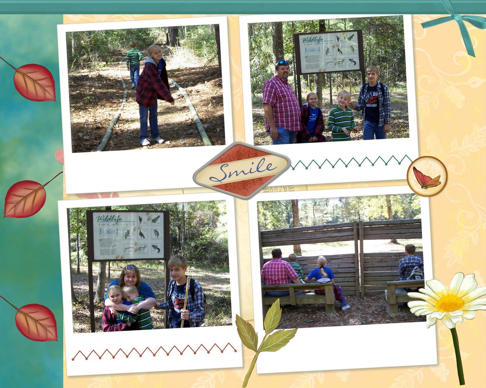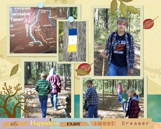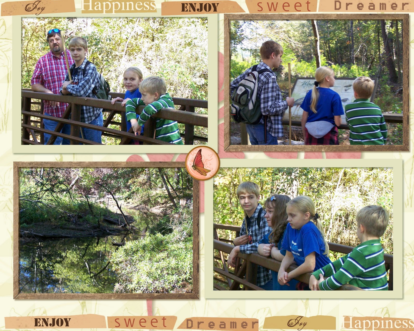 The bridge was scary because when you got to the top of it, it would sway and I have a fear of bridges anyway so I fussed at Stewart for swaying the bridge too much. We continue on for what seemed like forever. The whole time we are sure we are going to get to the car just around the next curve. The kids are getting tired and so were Stewart and I. Finally we come to another big bridge this one was more rickety than the last but we see a map sign on the other side so we cross it, timidly. Once we get there we see that we have been on the wrong loop ever since the last bridge. We have no idea where to go from here except deadheading back the way we came. We had broke one of the worst rules of hiking, going out without a map or GPS. The kids and I are almost in tears out of sheer exhaustion. We suck it up and turn around and trudge back the way we came. I am hurting in my feet and hips pretty bad and end up stumbling and falling and getting both my knees dirty but I did not hurt myself. The kids got real quiet. I ask what is wrong. Austin tells me Anna is afraid I will not want to go on into Beaumont and shop now that my knees are dirty. I tell her, “You know what baby girl, mom fell and got dirty too because I fussed at you for doing it and I shouldn’t have. I will still take you out to eat and to Toys-R-Us for your birthday, dirty knees or not. We are country folks that have been out hiking and I don’t know these people in Beaumont so I really don’t care what they think of me!” That seemed to reassure her and we trudged on. She was cold so I gave her my long sleeve over shirt. She slipped it on, over her pack and all. So I called her my little hunchback. She was not real impressed with that. Adam whined a little bit and Anna started dragging up the rear. I tell Adam if I am not whining he is not allowed to either and I take Anna’s hand and we walk on. I prayed, “God, please give us the strength to get back to the car and please do not let it rain on us.” Amazingly the trip back to the car took no time at all and the good Lord kept us dry. My best guess is that we walked close to 4 miles because of my mistake of not bringing the map. A mistake that will not happen again. I am actually proud that we walked it with very little problem.