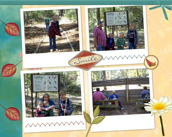 We come to a wildlife viewing booth, so we stop for a photo op. We set and look out the viewing area, we saw a few butterflies and noticed bird and squirrel houses on different trees. Stewart says jokingly, “Que the deer.” We were all talking and laughing and Adam scolds, “You guys be quiet or the deer won’t come out!” I laughed and explained daddy was only joking, and that the deer were not going to come out right now anyway.