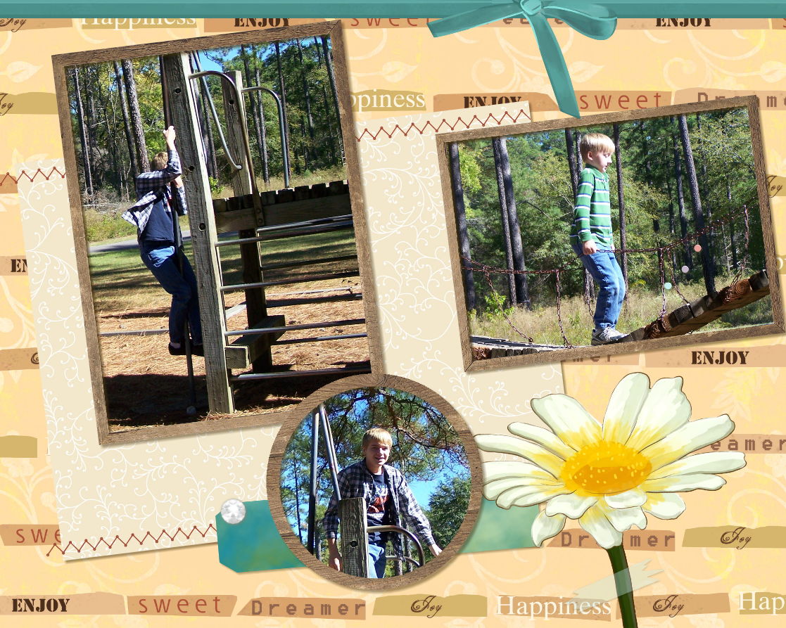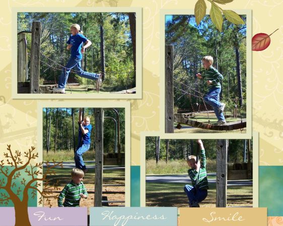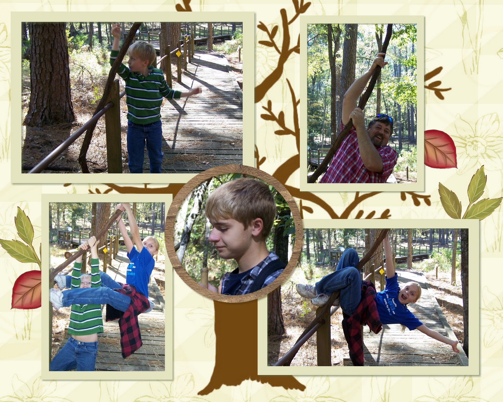 Austin decided to try the fire pole out, passively of course. Then he climbed back up the pole and gave me a big smile when he saw I had got a picture of him. Adam ran back to the bridge and grabbed both chains and shook it like crazy…”Earthquake!” It was time to head out on our hike though the kids thought it was much too soon. I was afraid they would get wore out on the playground and not feel like walking the hiking trail.