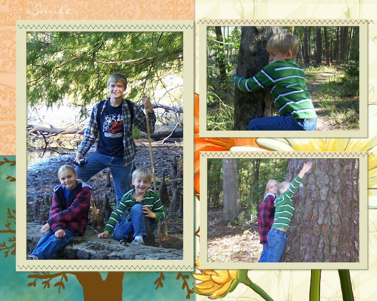 The cypress tree was growing a bunch of Cypress’ knees up beside the bricked area of the lake so we stop to take a picture. Adam tries to climb a tree, then he and Anna hug the huge pine tree. My little tree huggers, I am so proud.