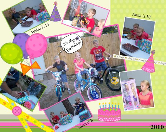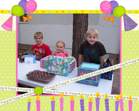 They all seem very happy with this idea and they all had a great birthday this year. I have some awesome kids. They were all patient and took turns blowing out their candles and opening presents. The way we do the candle blowing is I start out the cake with the fifteen candles needed this year for my oldest Austin, then I remove five and relight, and then remove two more and relight so each kid gets Happy Birthday sang to them and all get to blow out candles. Stewart cooked some burgers on the grill and we had cake, then the cousins all played and the adults sat around and chatted till it was time to leave. A successful party for 2010!