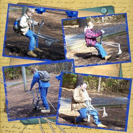 We load up in the car and drive around to where the hiking trail begins. Of course, there is a park right there and all my kids had to take a turn at the cool little backhoe toy there. Yes, even my biggest “kid” had to give it a try. Stewart says we need one of these at our creek, then maybe he could get the kids to help him dig dirt.