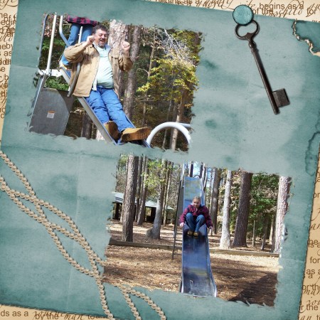Stewart and Anna play on the slide. Quickly he realizes he has not lost THAT much weight yet. “Hunny, I …ammm….stucckkk,” he calls as he scoots himself down the slide. Anna naturally goes down with ease. Her hiking books slide just fine on the metal.