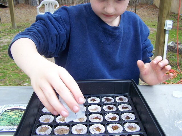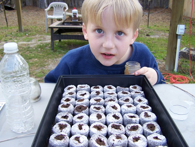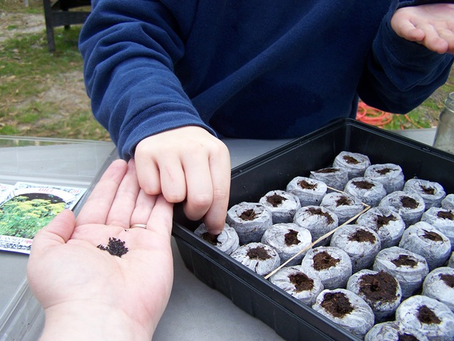 Adam takes a pinch while I hold the seeds for him. He is not crazy about dealing with the tiny seeds but was completely amazed by how small some of them were.