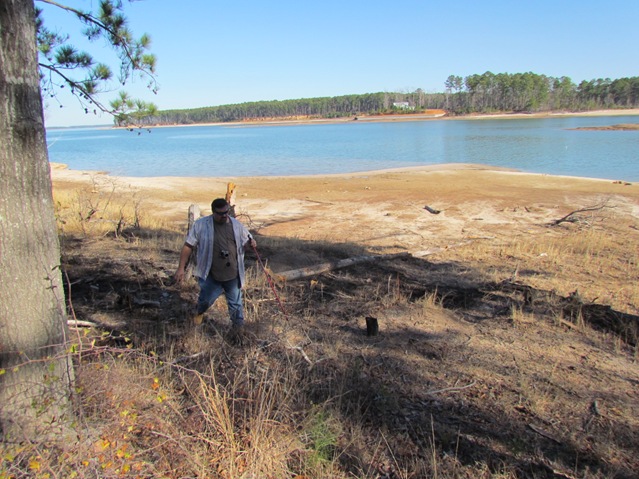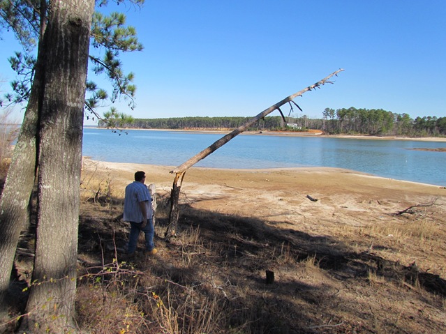 As we head out up the embankment to the car Stewart spots a dead tree that was partly burned at the base. He decides to give it a shove.