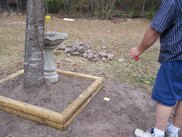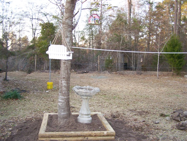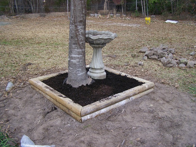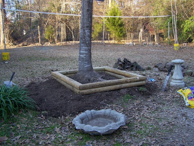 Two tiers high of landscape timbers and it is built. I pulled my old bird bath over to see if it would fit in the square.
