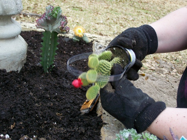 I put on gloves hoping to not get too many thorns in my hands. Needless to say on I still got pricked but not near as bad as I would have had I not adorned the gloves. I was careful to slide the cacti out of their little pots so that I would not damage them or me.