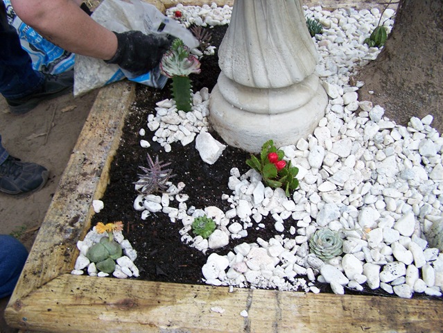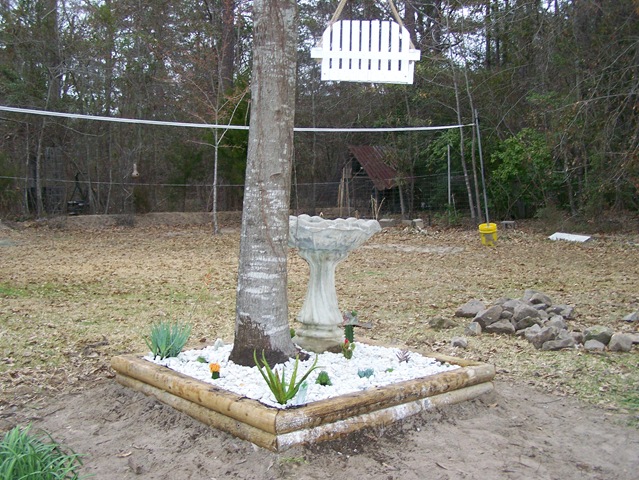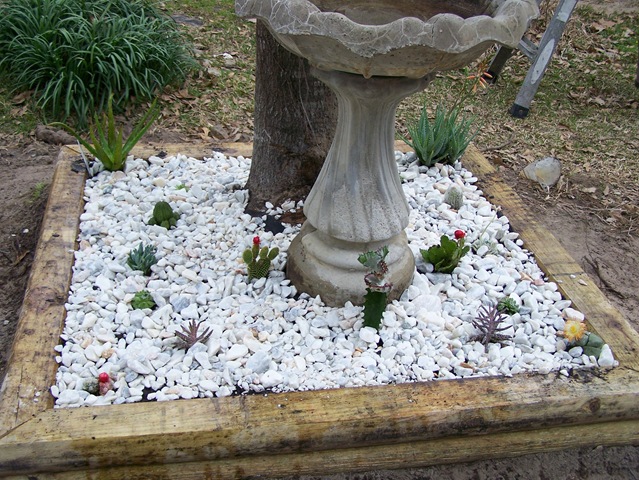 I think it turned out really good for my very first cactus garden. A little patch of beauty in my yard. Now I can enjoy watching the birds feed out of my little “swing” feeder and bathe in the bird bath. We also have a small bird house and a humming bird feeder in the tree. Now that it is done I long to sneak out in the morning before everyone wakes up and sit on my porch, enjoying the peace and quiet, watching, and hopefully taking a few pictures to identify of the birds that come to visit.