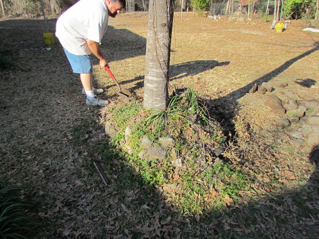 When we first moved here we build a little flower garden out of rocks around the small oak tree in our front yard. We did this to disguise the mound and stump that was left of the other tree we cut down. Well over the last few days it got a make-over.