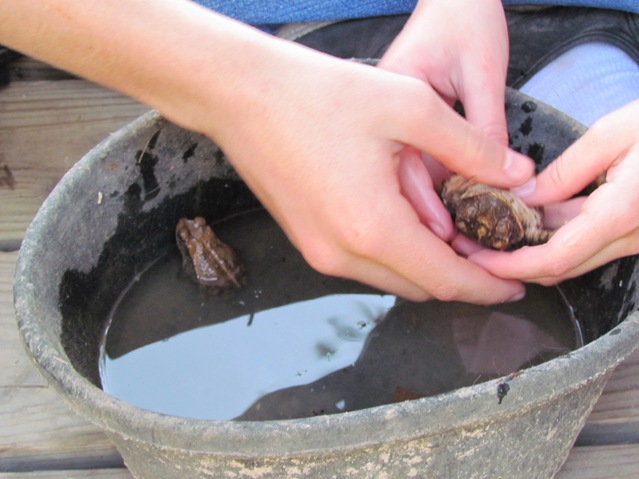 The ants we disturbed attacked the poor little toads. The kids grabbed the dogs water pan and quickly started to pull the ants off the little guys.
