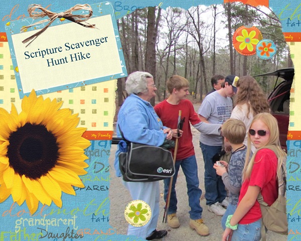 I found on the internet a sight that suggested to have a Scripture Scavenger Hunt. I took a few minutes to adapt it with scriptures of common things we could find on a hike and we were ready.