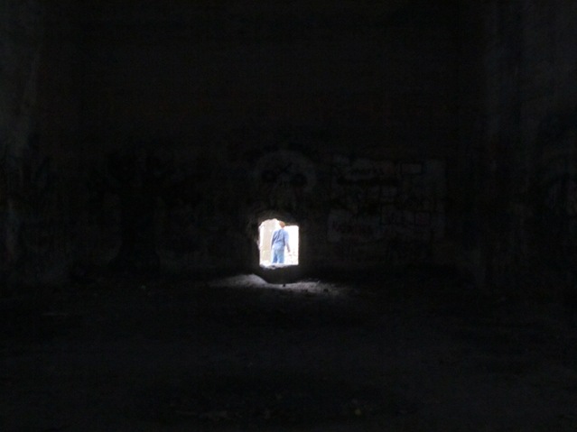 The third building still had a roof intact and was extremely dark. As soon as you walk up to the door you can feel to coldness coming from this room. All playing in with the spookiness that so many have labeled this place with. I can see Adam through the small hole in the back of the building.