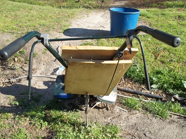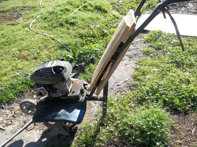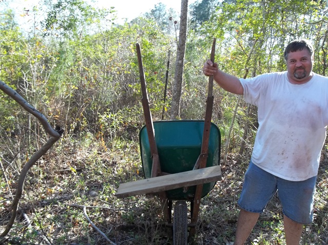 This is his “old” wheelbarrow, stabilized with a 2X6 and handles replaced by the broken rake handle!