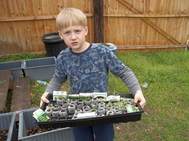 Austin working on getting his plants started. Radishes, carrots, cantaloupe, egg plants, and the giant pumpkin seeds are waiting to be planted in the tray.
