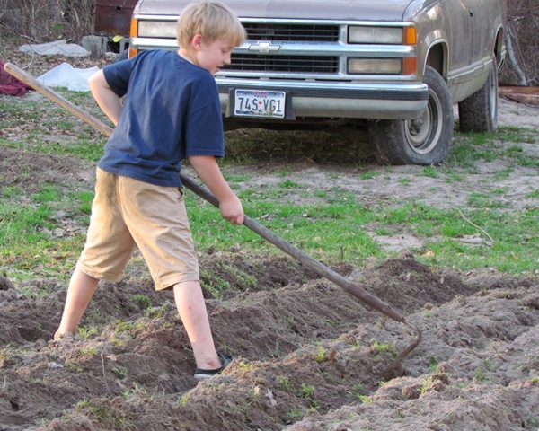Stewart tilled it for him and Adam got to work hoeing it into rows.