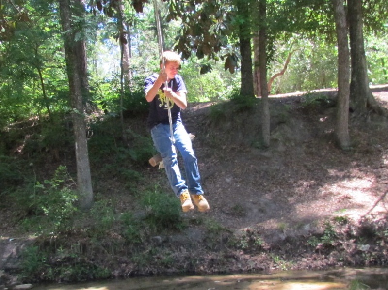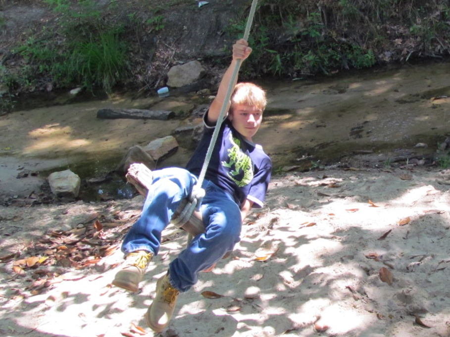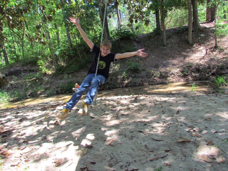 Austin figured out that by running in a circle and holding the rope taunt, he would get enough momentum going to swing out over the water.