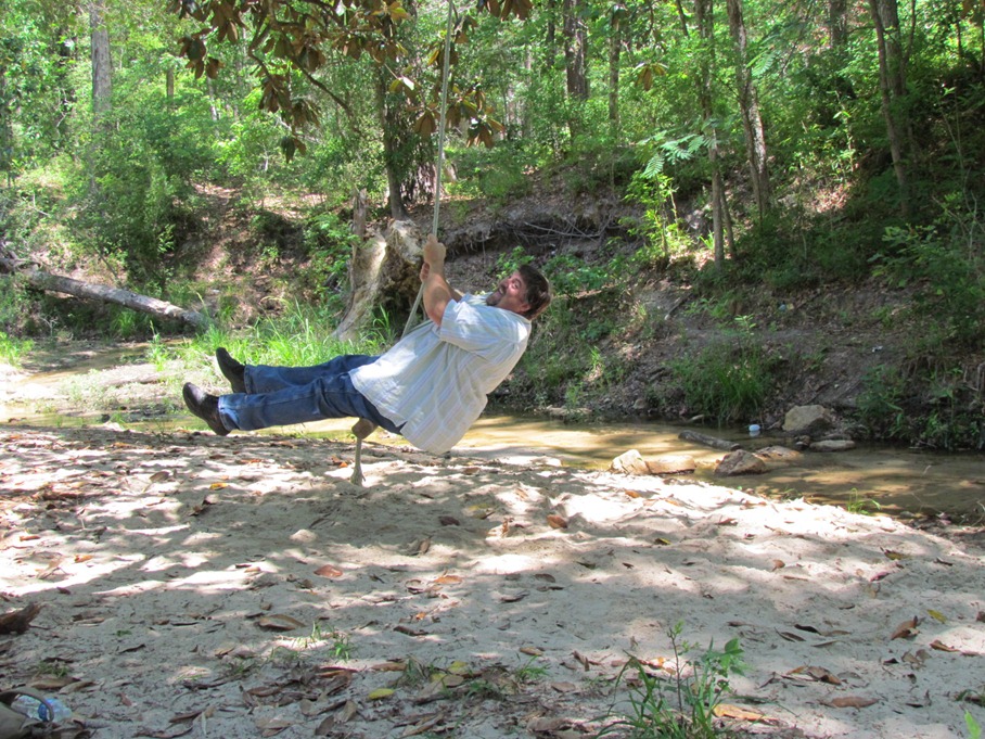 As we wandered along we spotted the tree swing. A large Magnolia has a rope with a piece of landscape timber tied to it for a seat. Stewart remembered it from his high school days. Back then it had the stream flowing under it but now it was sand.