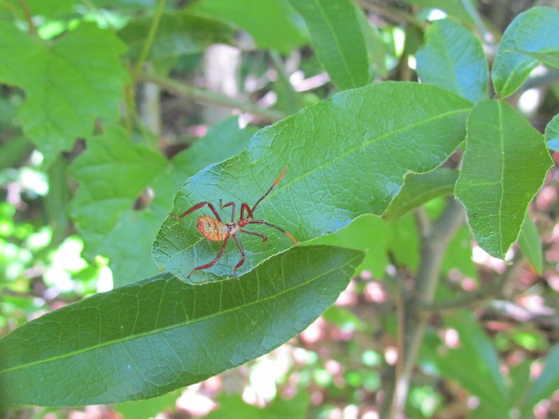 An Assassin Bug (probably a nymph) on a dicot leaf..