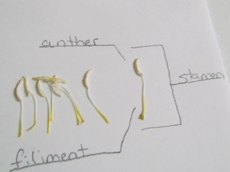 Then we talk about the girl and boy parts of a plant. The stamen is the boy part. Of course Adam started just calling it the “boy parts” and “girl parts.” We labeled the anther (pollen producing top piece), the filament (the pole that the anther is on), and both together is the stamen.