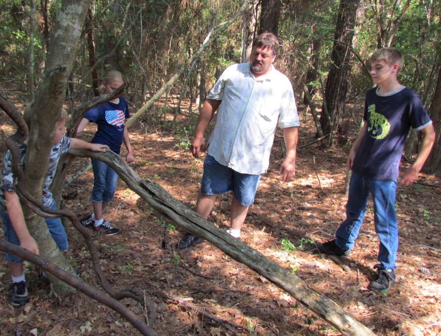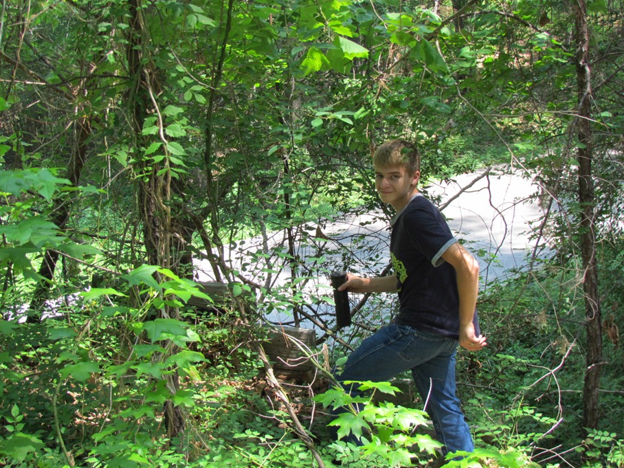 Some of the caches are really small and not hid where you would first think. They are hidden off in the woods and takes a long time to find and that make little kids grumpy and whiney, (can you see it hanging from the tree limb a little black metal cylinder by Stewart’s shoe.)