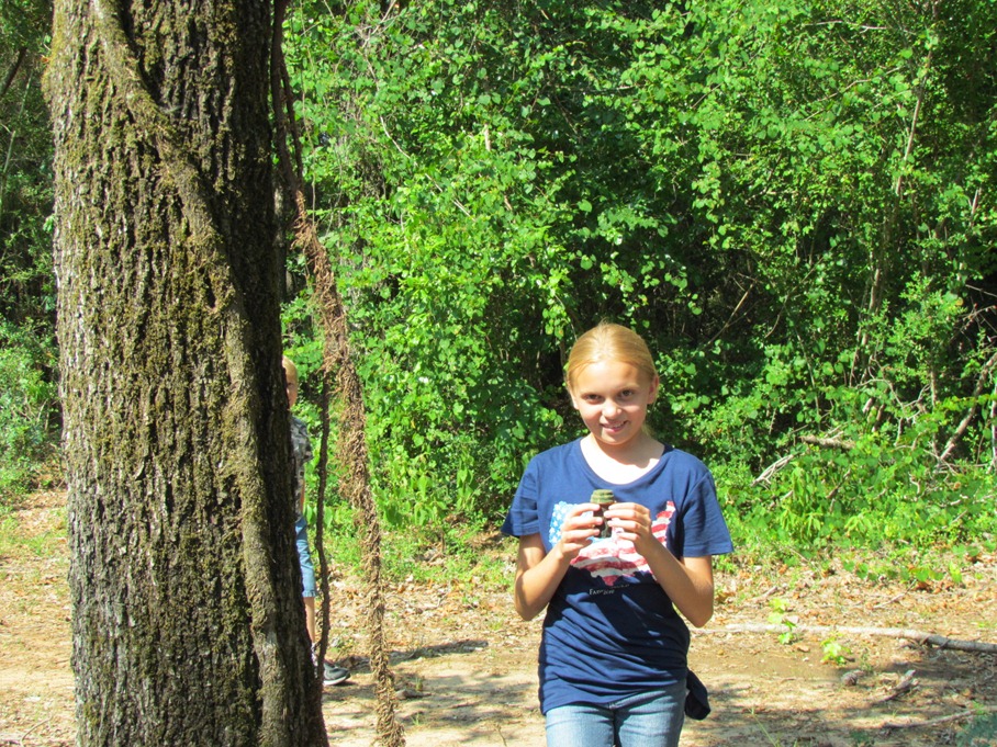 A happy little girl! She is very proud of herself, she snagged the first find of our second day and our first ammo box cache.