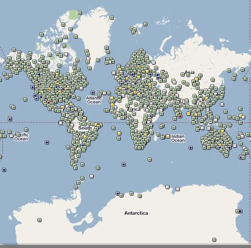 At this time, there are 1,413,284 (and counting) active geocaches around the world. They are on every continent and most countries. The little squares represent caches.
