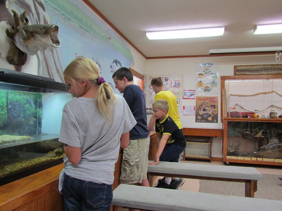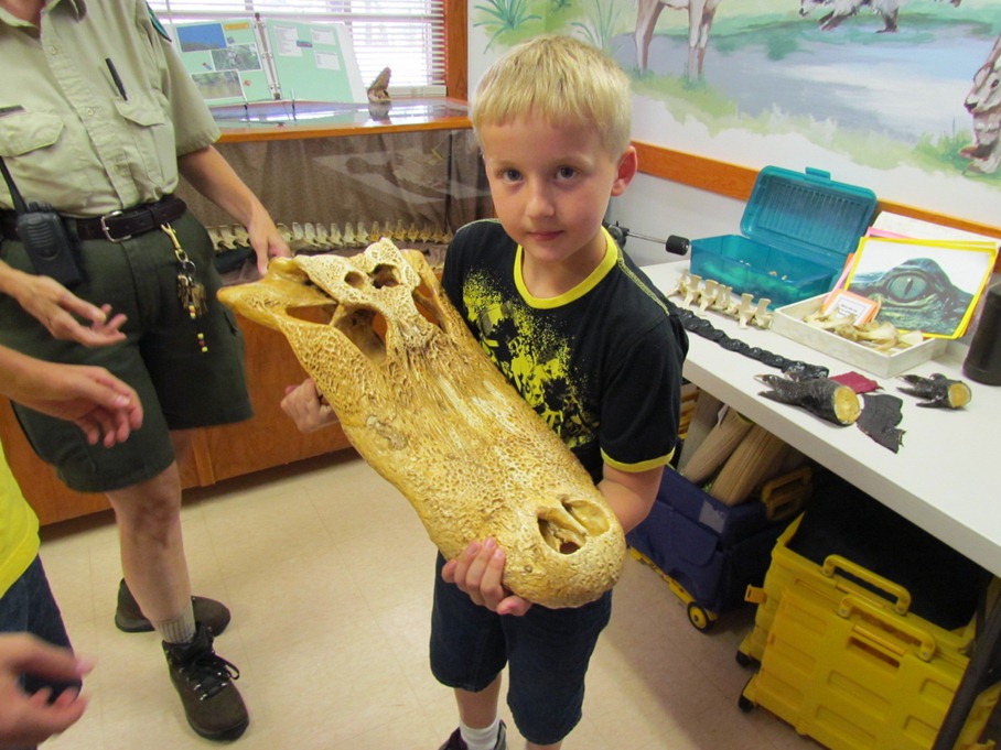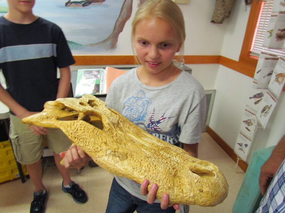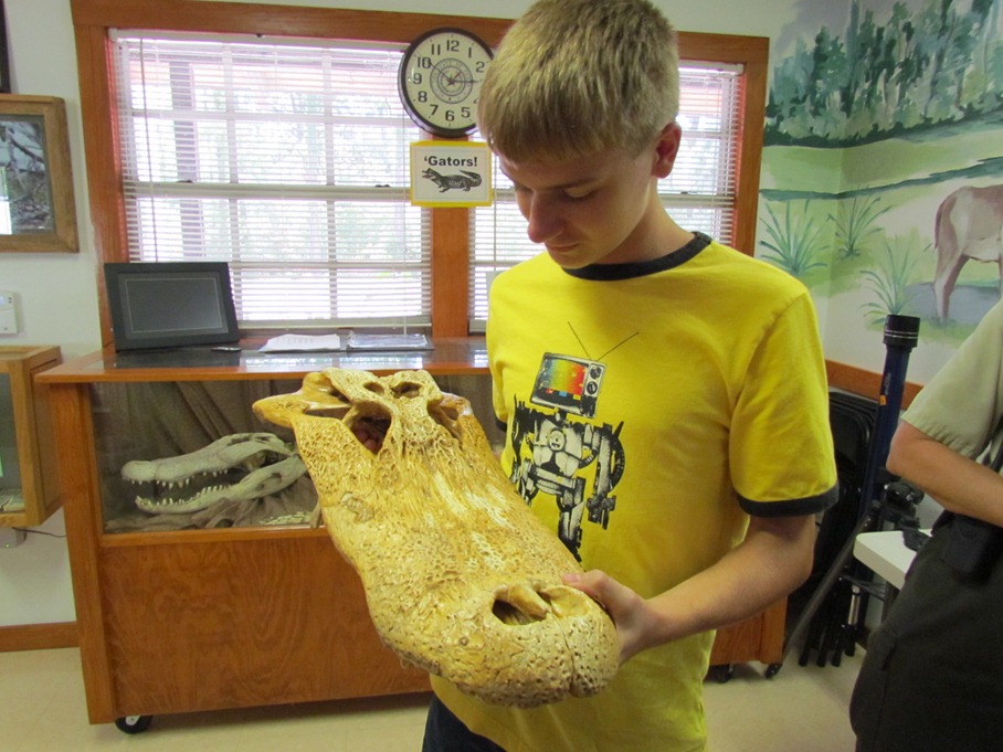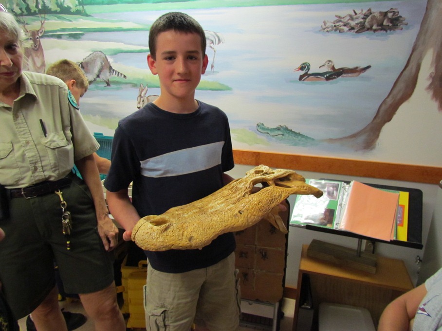 We arrived a bit early so we looked around the Nature Center. Ms. Katherine talked to us about some of the exhibits. Each of the kids took turns holding the alligator skull as Ms. Katherine explained about how alligators regrew its teeth and other interesting facts.