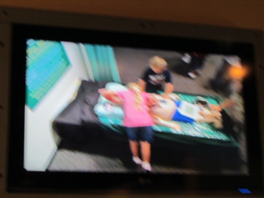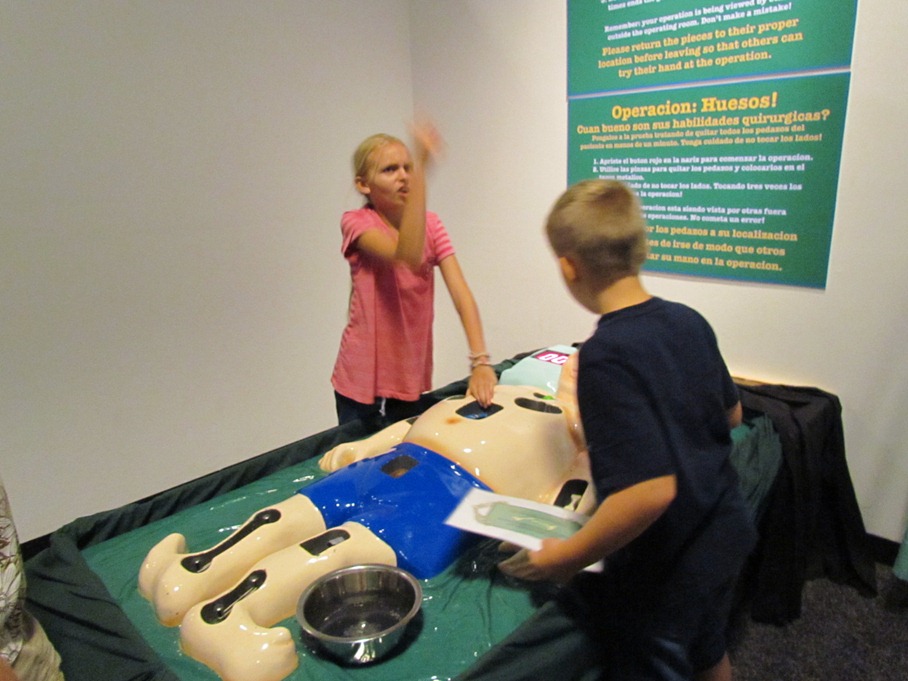 Mr. Operation was broken, so Anna commenced to trying to revive him and give him CPR. There was an overhead camera projected to the screen showing her best efforts to bring him back, but alas, no such luck, he was still broken.