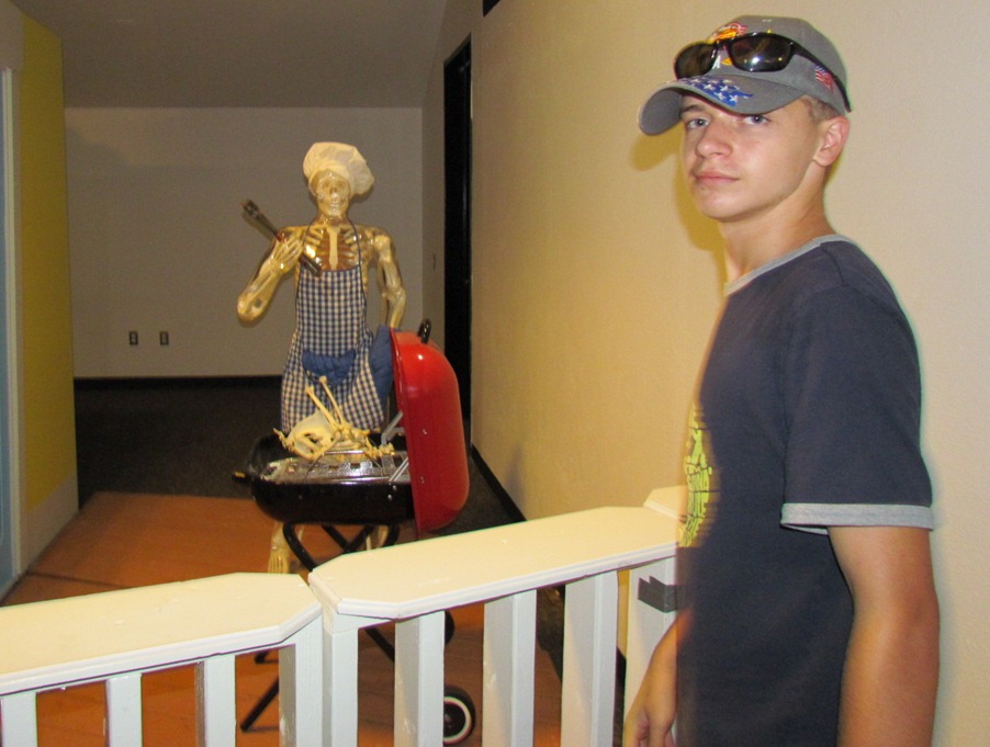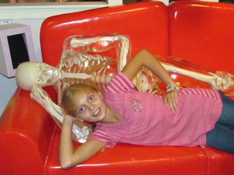 Anna lays down beside the skeleton, “Move over dude, I want to watch TV too! Adam of course had to try that too!