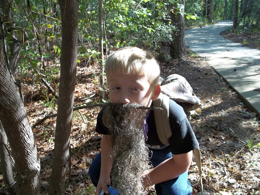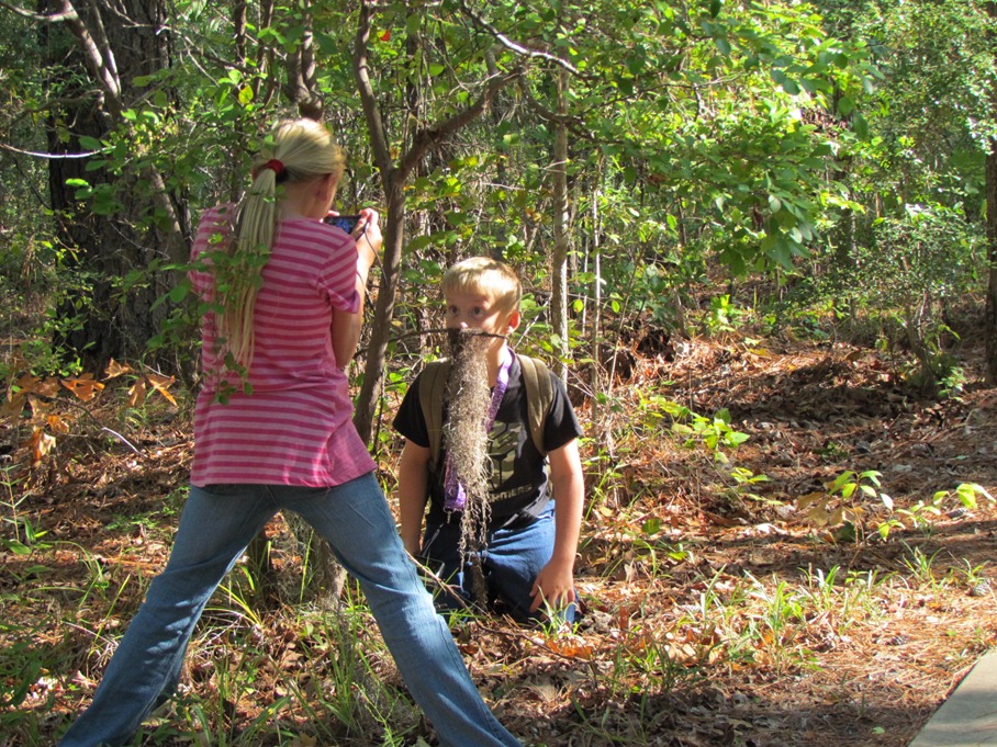 Adam using his wonderful imagination and posed as an old man with a Spanish Moss beard for Anna in her photographer stance.