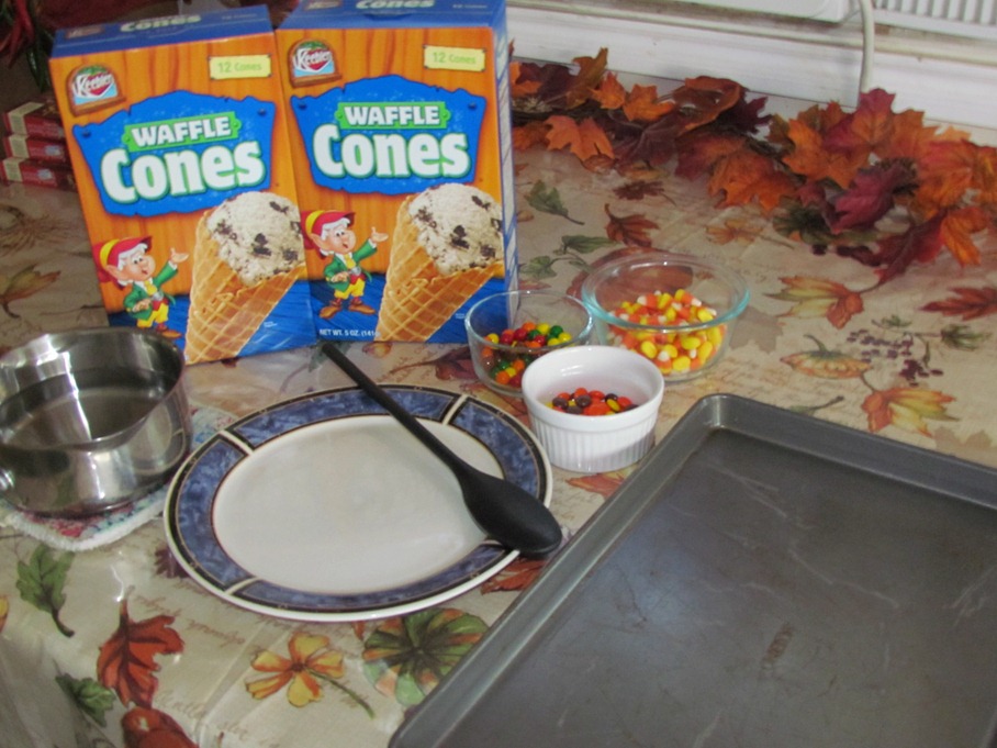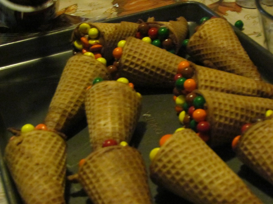 I then took the fall colored Sixlets and dipped the iced cone top in them attempting to make them look like Cornucopia. Not sure if it was a successful “sight” but the kids seemed to eat them just fine except for the semi soggy almost stale textured tip that we had stuck in water.
