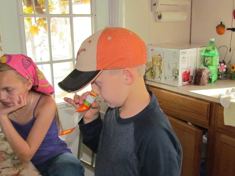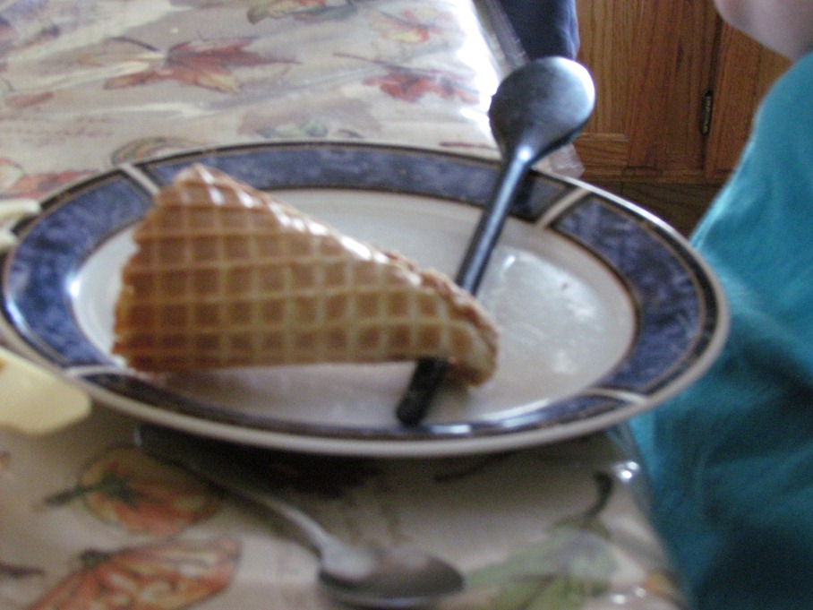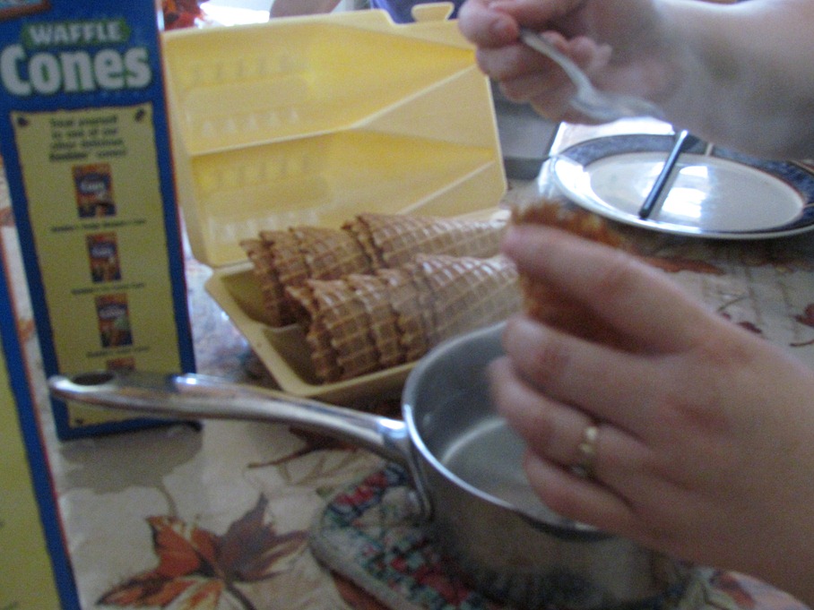 Austin “manned” the camera while, I got all the stuff together I needed and began soaking the sugar cone tip in hot water. This did not work out so great, it turned the cone into a slimy mess. That is when I realized I had “Waffle Cones” not “Sugar Cones” so hubby had to run to the store and get the right kind so I could start over. Then next try was not much better but I stuck with it anyway.