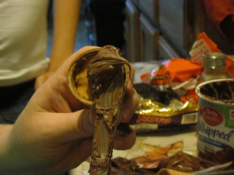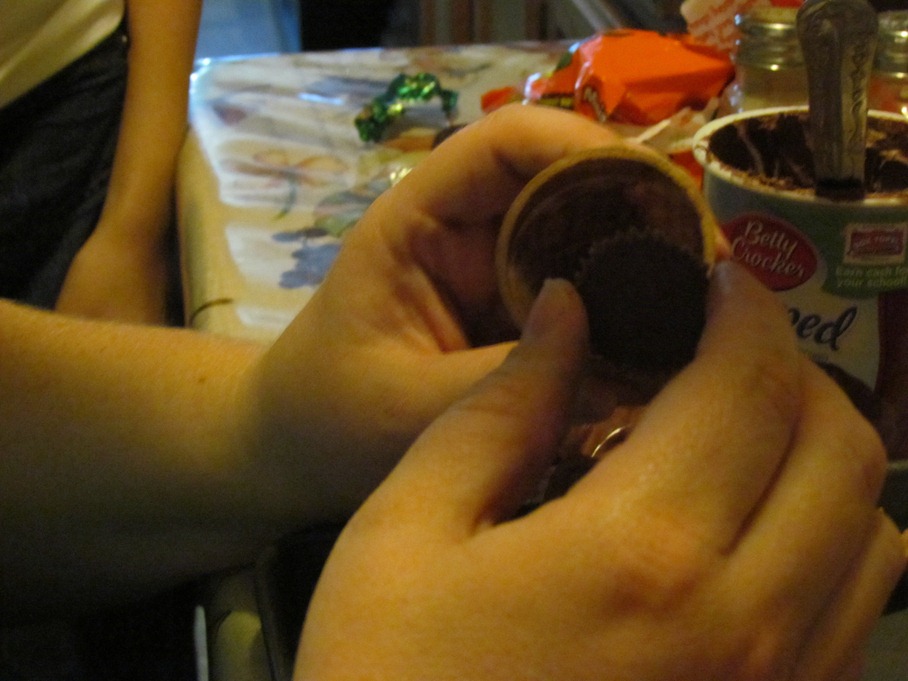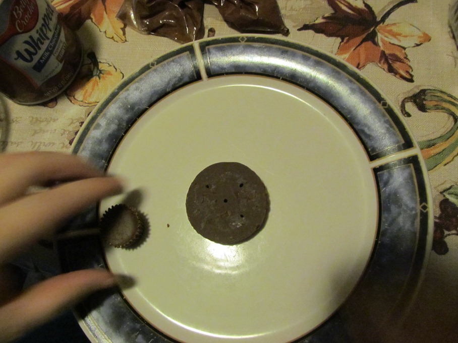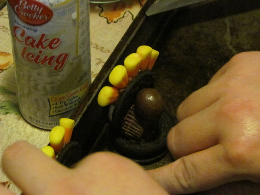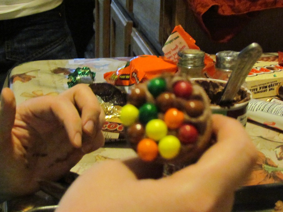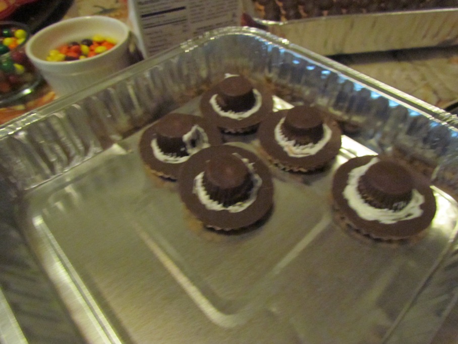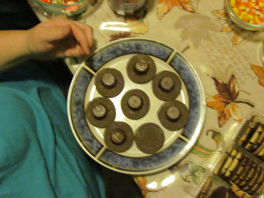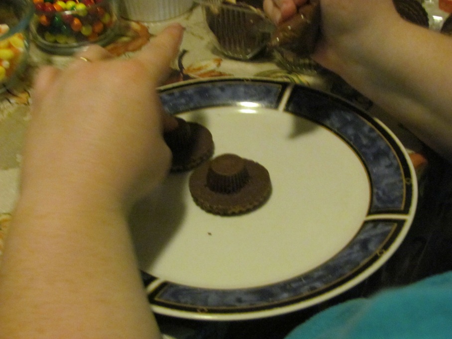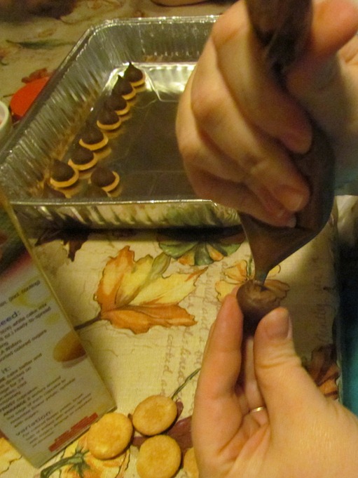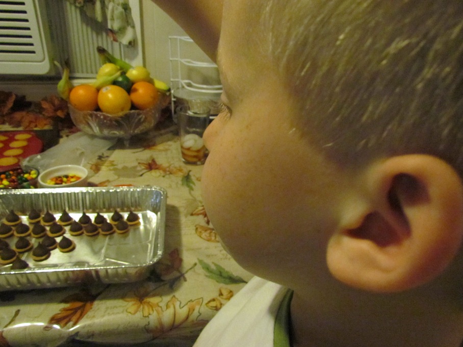 Next were the Acorns! It said to use NutterButter Cookies instead of Mini Nilla Wafers but Hubby refused to make another trip to the store so I worked with what I had. These were pretty simple, icing on cookie, stick Hershey’s Kiss to Icing…done. Adam has a bad habit of acting everything we talk about out. He was playing around in his excitement and we told him to stop before he knocks over the acorns. Of course he acts out knocking over the acorns and actually did knock them over in his acting it out. He was horrified and I fussed at him and made him sit down and be still. Thankfully they only fell all over the table and were not ruined. To this day we still pick at him when he acts out stuff. We will all say at one time, “Acorns!”