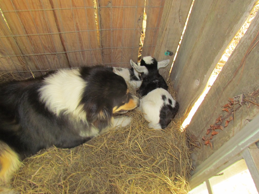 We introduced Kelev to them and he crawled up in their sleeping loft with them and laid down to watch over them. He is such a good dog, but they were not sure about him!