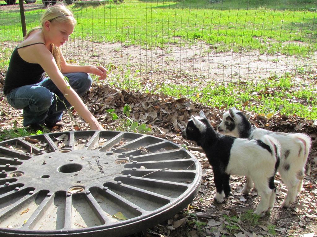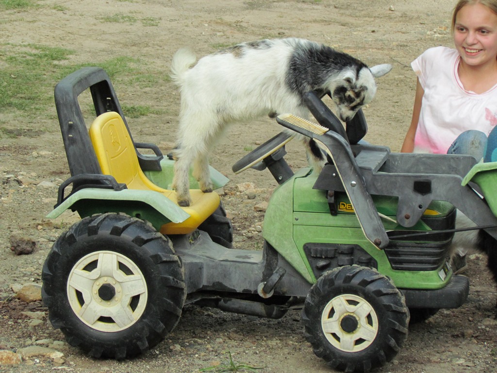 Anna and Adam decided the goats needed to ride their old toy tractor.