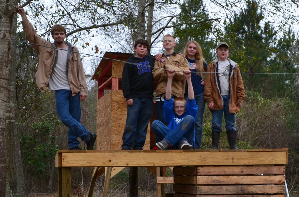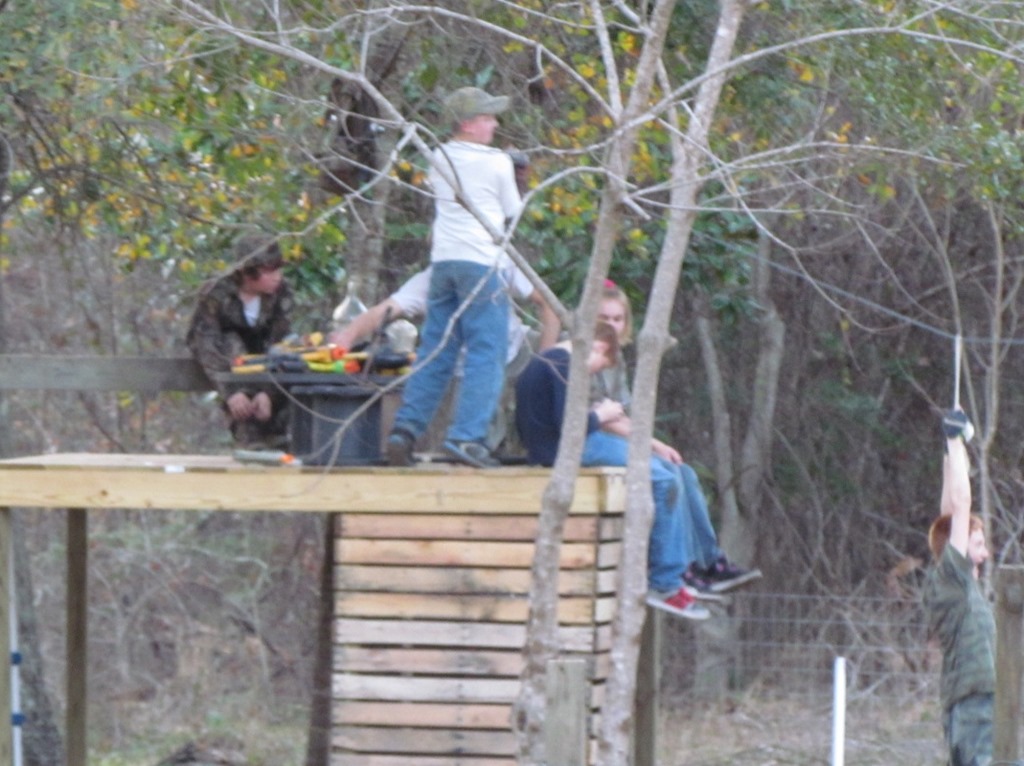 It didn’t take long before the neighborhood boys had to come play in the “tree house”! They don’t seem to mind it is only a platform and a dungeon!