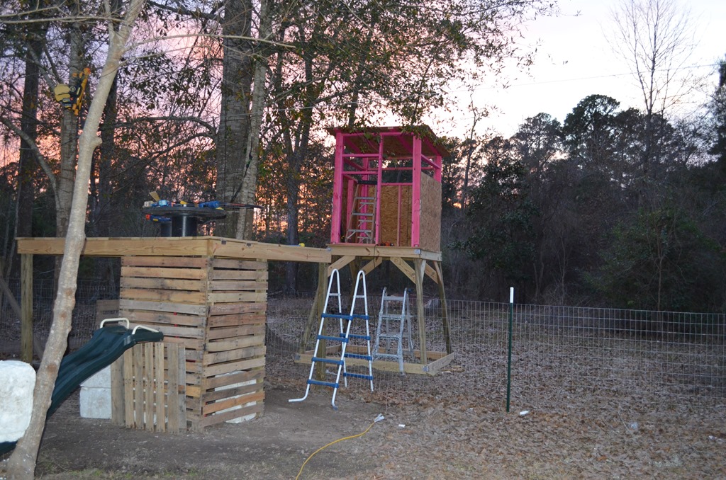 Hubby had the idea to make it look like a cottage, but my boys said no, that it needed to look more “fort-ish” …so “deer stand” it is!