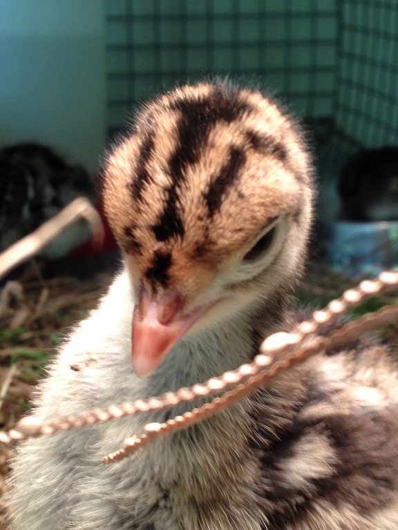 When I went to purchase my five little turkeys, I really only wanted one or two males. I read online that the males have more of a square head and females a more triangular head. That was not so easy to distinguish when looking upon a brooder full of chicks. So I tried to determine their sex by the size of their beginning snood bump. I am not sure if this is a good indicator or not but in a few months I will be able to know for sure. One of the fun things about being a first time farmer with no mentor, there is a lot of experimenting and trial and error to learn how to do things.