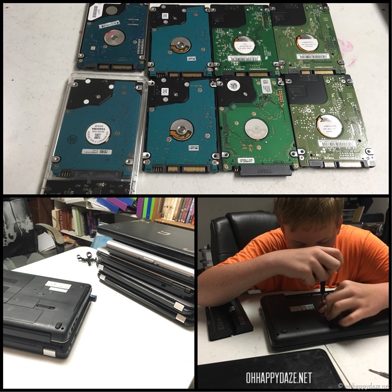 We have gone through our fair share of cheap computers over the years with us homeschooling three kiddos, so Adam and I decided to take their hard drive out and put them in a hard drive enclosure {ad} and use them as portable hard drives! We salvaged 8 of them while he learned a tad about computer repair!