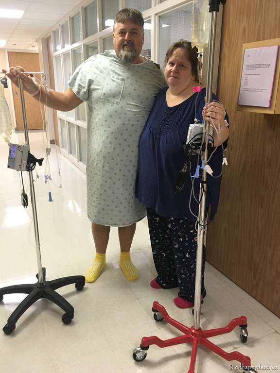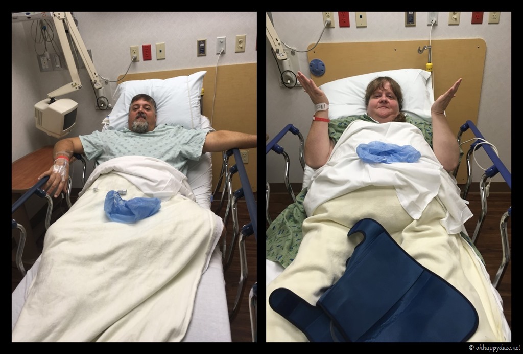 They gave him his gown, socks, and hair net thing and he got suited up. I gathered his clothes and put them in the bag they provided and we wait. He kept telling me how sorry he was that he was going first. He was so worried about me having to deal with my nerves all on my own. I honestly felt ok at that point, my 4AM last ditch effort to get him to back out had failed so I was in “cowgirl up” mode. We talked and comforted each other between nurses coming in and asking questions, starting an IV, and taking vital signs. The one nurse had the surgery 7 months ago and her testimony was very helpful in calming us. After about 2 hours of waiting the doctor came in and said he was ready to go, I kissed my hubby and watched as they rolled him away.