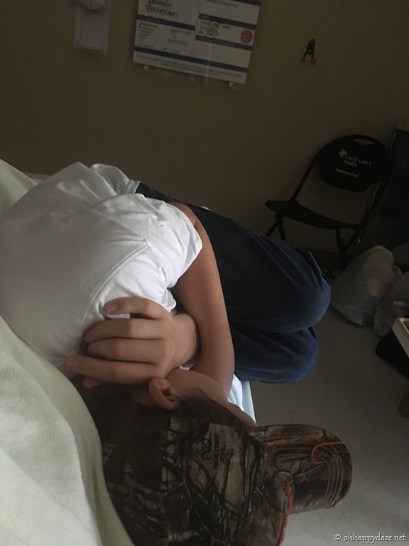 Stewart came back to my room occasionally, I finally got the nurse to undo my IV so I could put a shirt on and then I was ready to get up and walk with my hubby about the floor. It was slow moving and I felt a little unstable still but the pain was managed and the kids were there if we needed to be steadied. Hubby would pop in and out of my room to visit and the go to his to nap. When he was asleep Adam would come to my room and visit and lay beside my legs on my bed. It reminded me of when I had my last big surgery, the boy wouldn’t leave my side, not much has changed except his size.