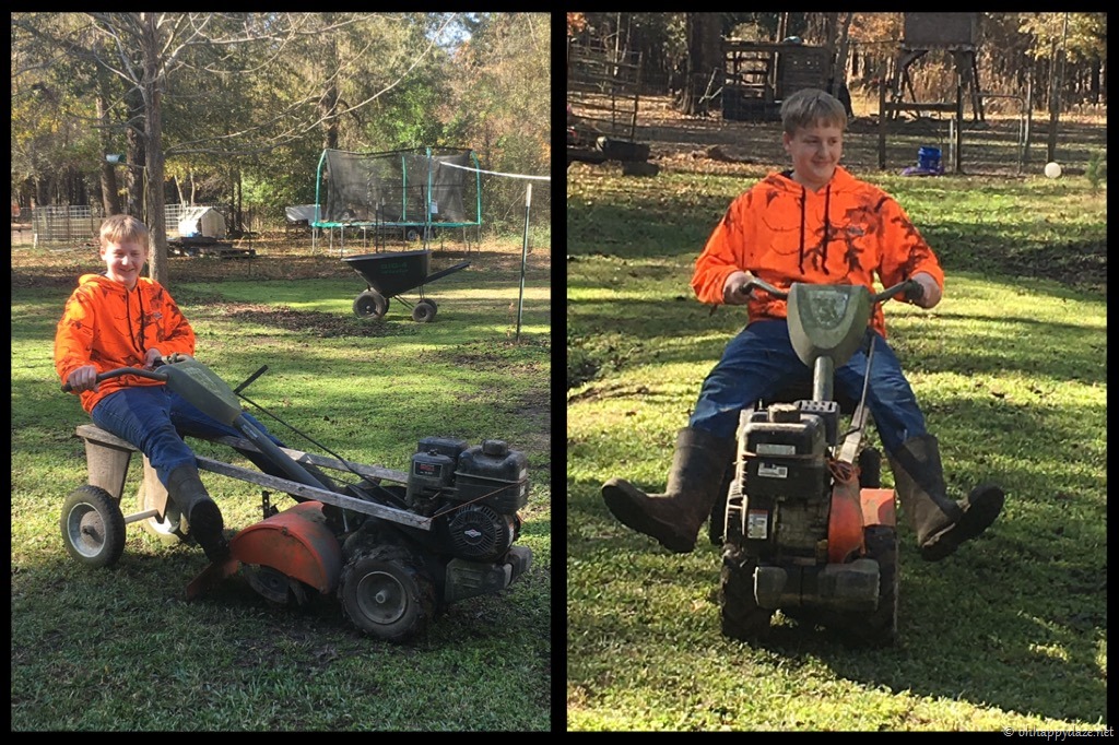 Boy will be boys! Hubby asked Adam to burn out all the old gas in the tiller so he hooked up his makeshift donkey cart and let the self-propelled tiller do the work! Smart redneck I have right there!