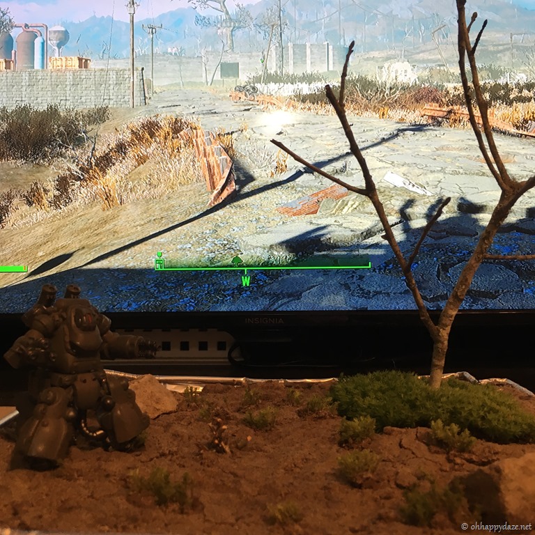 So, confession time, Hi, my name is Becky, and I am addicted to Fallout 4. I play it to find some peace in my life, an escape. I tend to play it A LOT! So, Adam decided I would like a little more tangibility in my fantasy world. He would take the Fallout 4 action figure of the sentry bot and make a diorama of the “wasteland” for me and so we positioned it in front of my game on the TV, it blended in quite well!