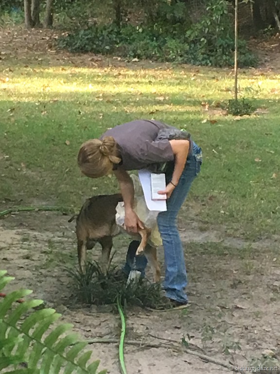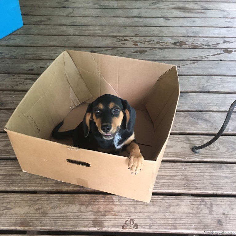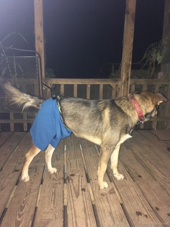 Biscuit was neutered today. I think he knew. Afterward, the poor guy had to wear a diaper to keep from licking himself and Anna had to help him potty so he wouldn’t wet his diaper! I finally felt sorry for him looking like a dork and got him a pair of boxers to wear, then he looked like a surfer! The things we do for our pets!